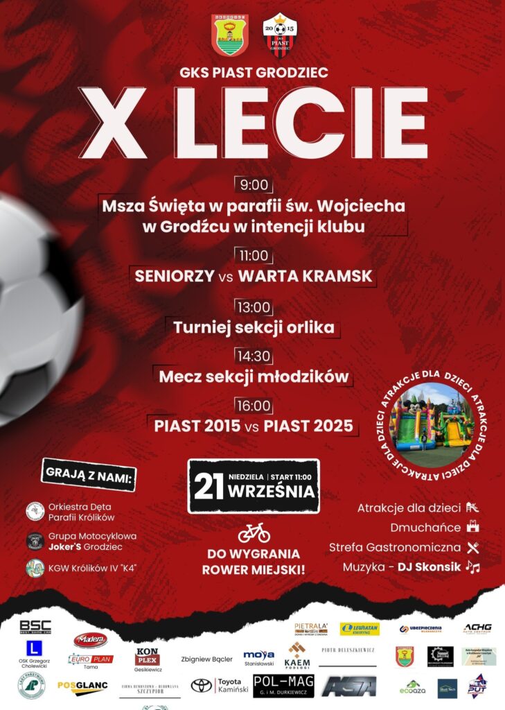 21 września w Grodźcu odbędzie się wyjątkowe wydarzenie – jubileusz 10-lecia GKS Piast Grodziec. To dzień pełen sportowych emocji, rodzinnych atrakcji i wspólnego świętowania całej lokalnej społeczności.