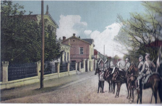 Kilka dni temu pokazywaliśmy kolumnę pruskich piechurów maszerujących ulicą Długą (obecnie 3 Maja). Dzisiaj Patrol niemieckich kawalerzystów na Słupeckim Przedmieściu ( obecnie Wojska POlskiego) obok pałacyku Reymonda.