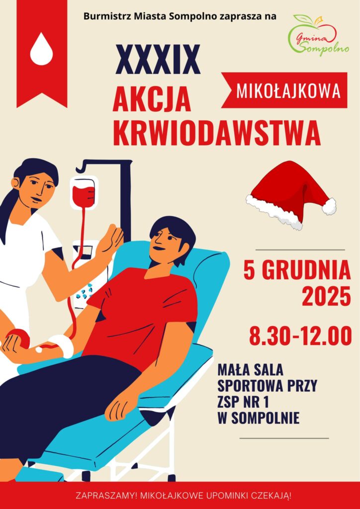 Dużymi krokami zbliża się XXXIX Akcja Krwiodawstwa w Sompolnie, która odbędzie się 5 grudnia 2025 roku. Wydarzenie organizowane w mikołajkowej atmosferze ma na celu promocję honorowego krwiodawstwa oraz zachęcenie mieszkańców regionu do podzielenia się najcenniejszym darem, jakim jest krew.
