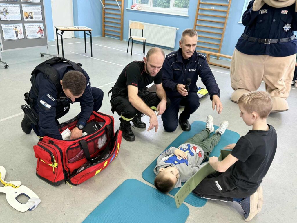 W zajęciach uczestniczyli asp. szt. Błażej Borowiec, mł. asp. Dawid Borowiec oraz policyjna maskotka Pyrek. Wspólnie ze strażakami – Dominikiem Kapuścińskim i Marcinem Walczakiem – przypomnieli uczniom najważniejsze zasady bezpiecznego poruszania się po drodze i zachowania w sytuacjach zagrożenia. Dzieci dowiedziały się również, jak udzielać pierwszej pomocy i jak ważne jest noszenie elementów odblaskowych, zwłaszcza jesienią i zimą, gdy widoczność jest ograniczona.