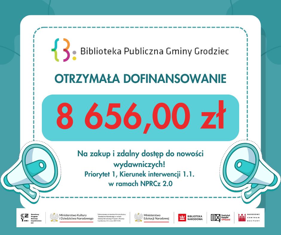 Biblioteka Publiczna Gminy Grodziec otrzymała dofinansowanie w wysokości 8 656 zł na zakup nowości wydawniczych w ramach zadania: