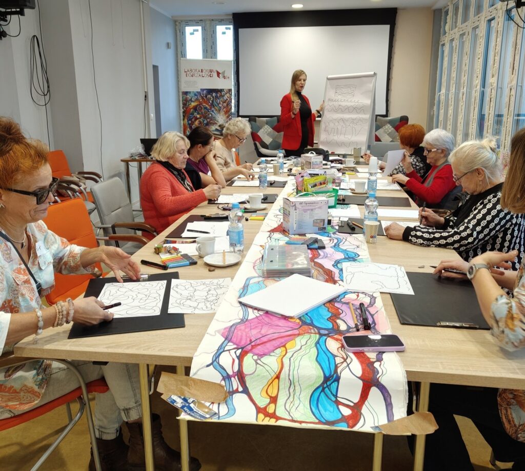 Już od pierwszych minut uczestniczki warsztatów dały się porwać procesowi, który łączył świat słowa i obrazu. Inspirując się ulubionymi książkami, przelewały swoje emocje i refleksje na papier w postaci neurografik – rysunków pełnych linii, barw i wewnętrznej ekspresji.