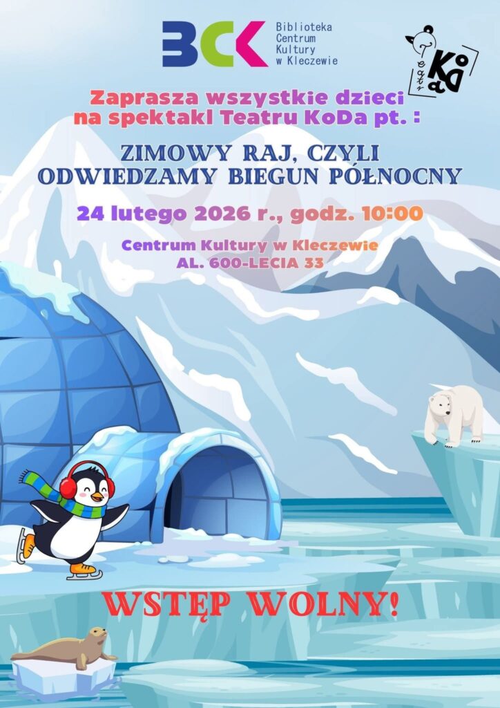 Zwieńczeniem zimowego wypoczynku będzie wyjątkowe wydarzenie kulturalne, które odbędzie się we wtorek, 24 lutego. O godzinie 10:00 na scenie Centrum Kultury w Kleczewie wystąpi Teatr KoDa ze spektaklem pt. „Zimowy raj, czyli odwiedzamy Biegun Północny”. Przedstawienie to jest dedykowane wszystkim dzieciom, a udział w nim jest całkowicie bezpłatny. To doskonała okazja, aby spędzić ferie w radosnej i bajkowej atmosferze, spotykając się z rówieśnikami podczas profesjonalnego widowiska teatralnego.