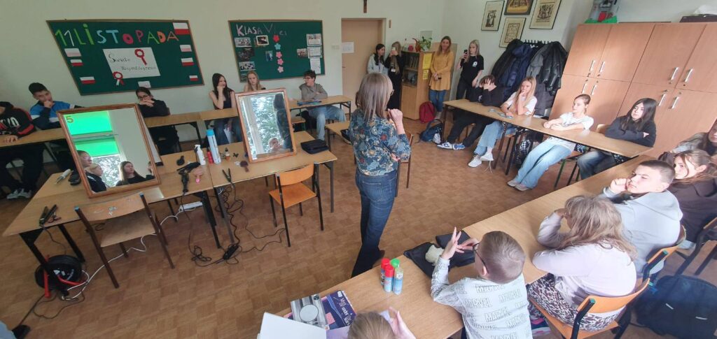Podczas spotkania uczniowie mogli zobaczyć, jak wygląda praca fryzjera „od kuchni”. Młodzież z technikum demonstrowała podstawowe techniki i omawiała narzędzia wykorzystywane w zawodzie. Podkreślano, że fryzjerstwo to nie tylko rzemiosło, lecz także forma twórczej ekspresji wymagająca wyczucia estetyki, precyzji i zaangażowania.