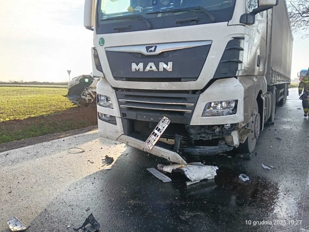 Na miejscu wypadku stwierdzono, że doszło do zderzenia samochodu ciężarowego z pojazdem osobowym. Samochód ciężarowy z naczepą stał na środku drogi powiatowej. Jego kierowca nie odniósł obrażeń i nie wymagał pomocy. Natomiast osobówka znajdowała się poza jezdnią, na polu, a w jej wnętrzu przebywały dwie osoby. Poszkodowana pasażerka została uwięziona wewnątrz pojazdu.
