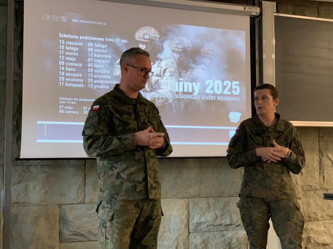 Spotkanie studentów I roku kierunku bezpieczeństwa wewnętrznego z przedstawicielami Wojskowego Centrum Rekrutacji (WCR) w Koninie, kapralem Michałem Tomczakiem oraz szeregową Ewą Grzelak, pozwoliło zapoznać się z szeroką ofertą kariery wojskowej. Studenci mieli okazję dowiedzieć się, jakie wymagania trzeba spełnić, aby rozpocząć służbę w Siłach Zbrojnych RP, oraz jakie możliwości rozwoju zawodowego oferuje Wojsko Polskie.
