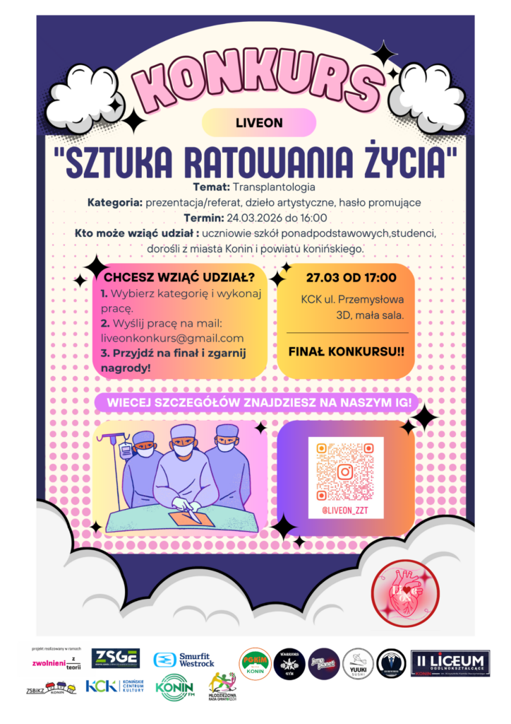 Konkurs o transplantologii w Koninie to inicjatywa przygotowana przez uczniów II Liceum Ogólnokształcącego im. Krzysztofa Kamila Baczyńskiego. Wydarzenie organizowane jest w ramach projektu LiveON, realizowanego w ogólnopolskiej olimpiadzie społecznej Zwolnieni z Teorii.