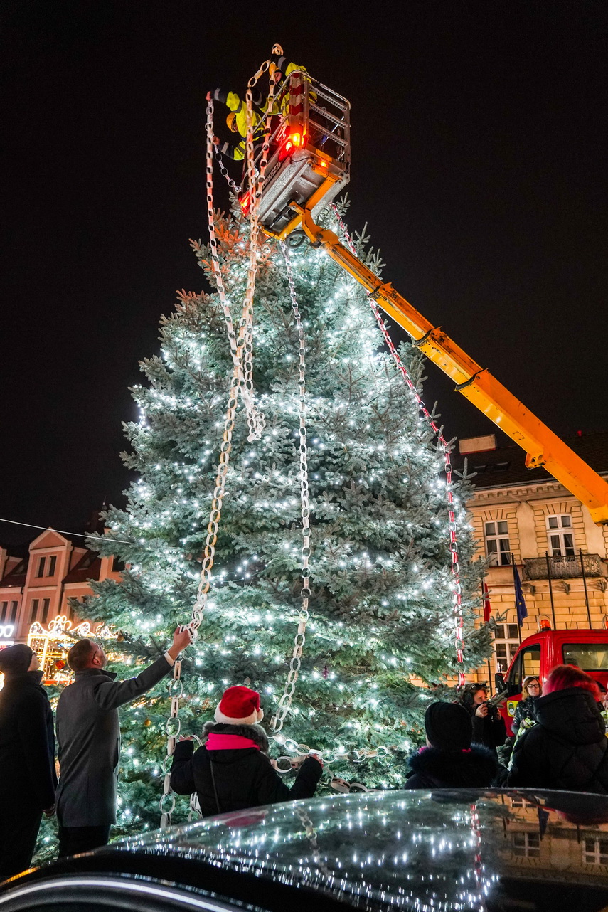 Zawieszanie ozdoby wymagało współpracy i specjalistycznego sprzętu – operatorzy z PGKiM użyli podnośnika, aby umieścić łańcuch na najwyższych gałęziach. W akcję zaangażował się również radny Tomasz Nowak, który dzielnie wspierał działania z grabiami w ręku. Na choince zawisły również inne ozdoby przygotowane przez koninianki.