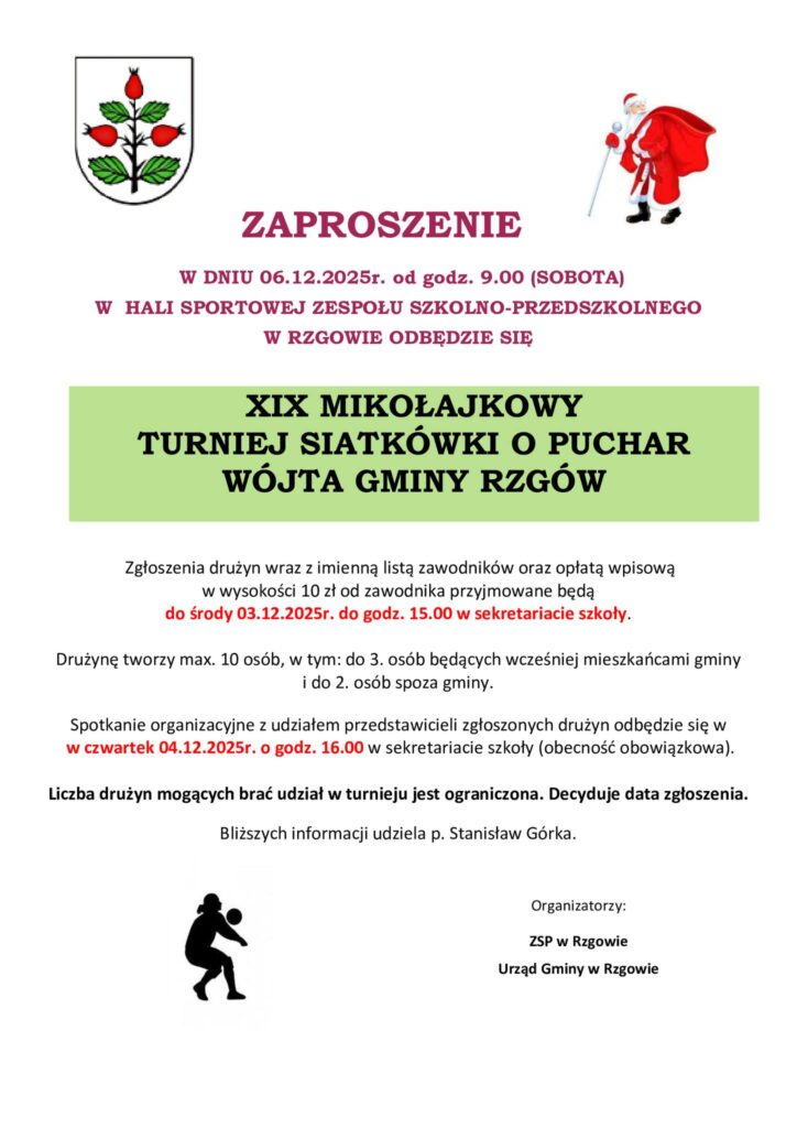 Zespół Szkolno-Przedszkolny w Rzgowie zaprasza na XIX Mikołajkowy Turniej Siatkówki o Puchar Wójta Gminy Rzgów. Wydarzenie odbędzie się 6 grudnia 2025 roku od godziny 9.00 w hali sportowej placówki. Organizatorzy podkreślają, że to jedna z najchętniej odwiedzanych sportowych inicjatyw w gminie, łącząca rywalizację z atmosferą przedświątecznego spotkania.