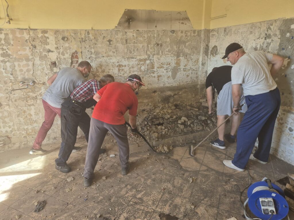 Przygotowania do prac budowlanych rozpoczęły się od zaangażowania mieszkańców, którzy wykonali szereg czynności porządkowych i demontażowych. Usunięto sprzęty i meble, rozebrano stary piec kuchenny, zdemontowano zlew i okap, a także usunięto płytki i przygotowano pomieszczenie do kolejnych etapów modernizacji.