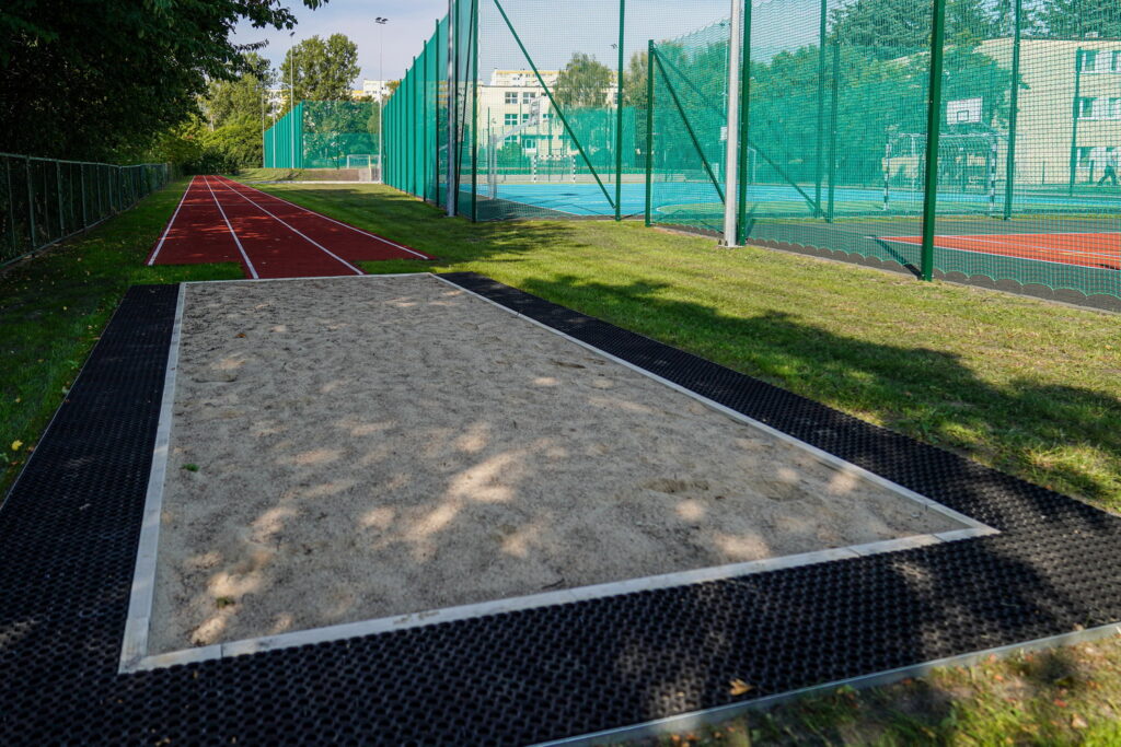 • 100-metrową tartanową bieżnię ze skocznią w dal,