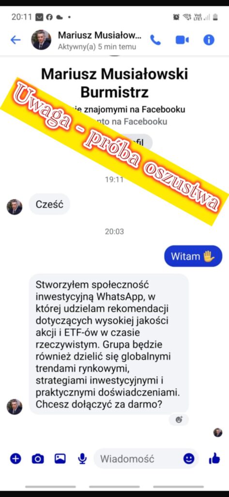 Burmistrz Kleczewa Mariusz Musiałowski poinformował o próbie podszycia się pod jego osobę. W sieci pojawiło się konto łudząco podobne do oficjalnego profilu, z którego rozsyłano podejrzane wiadomości. Samorząd apeluje o zachowanie czujności oraz unikanie wchodzenia w nieznane linki, co może narazić użytkowników na oszustwo internetowe.