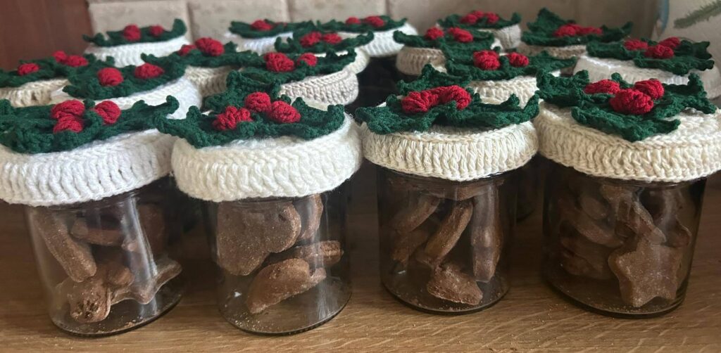 W Szkole Podstawowej im. Olimpijczyków Polskich w Kramsku przygotowano niezwykłe upominki, które łączą w sobie kulinarne umiejętności, ręczną pracę oraz świąteczne ciepło. Własnoręcznie upieczone pierniczki zamknięto w ozdobnych słoikach, a ich wieczka udekorowano szydełkową ozdobą z motywem gałązek. Całość wykonano z wyraźną dbałością o detale, co nadało prezentom niepowtarzalnego charakteru.