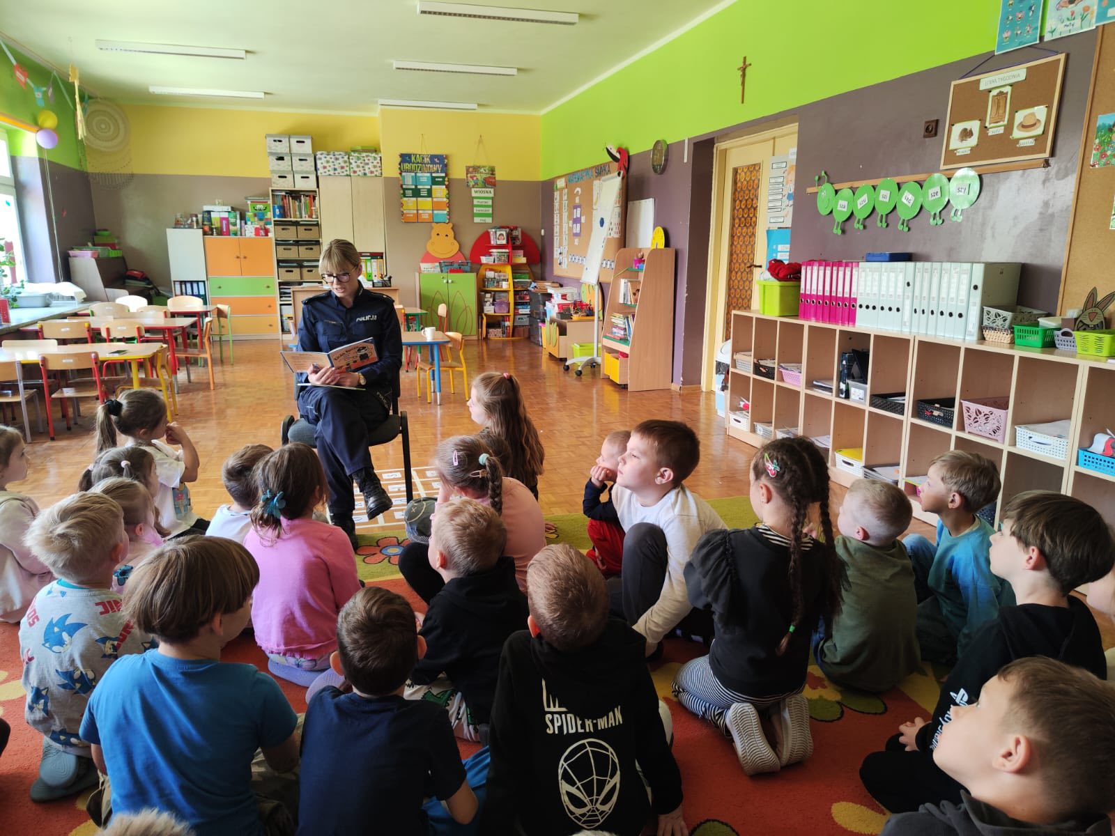 Podczas wizyty funkcjonariuszka przybliżyła maluchom specyfikę swojej pracy, czytając im książki o policji, zagrożeniach oraz sposobach ich unikania. Dzieci z dużym zainteresowaniem słuchały opowieści o radiowozach, kajdankach i zadaniach, jakie wykonuje policjant.