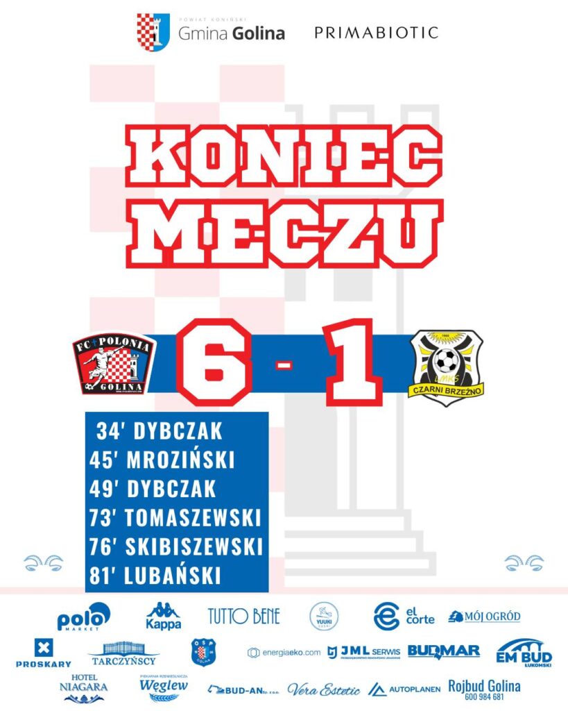 Polonia II Golina odniosła wysokie zwycięstwo w środowym meczu Pucharu Polski, pokonując Czarnych Brzeźno 6:1. Od pierwszych minut spotkania drużyna narzuciła własne tempo, nie pozostawiając rywalom żadnych złudzeń. Kapitalna gra zespołowa, skuteczność w ataku i pewność w obronie zapewniły drużynie awans do kolejnej rundy.