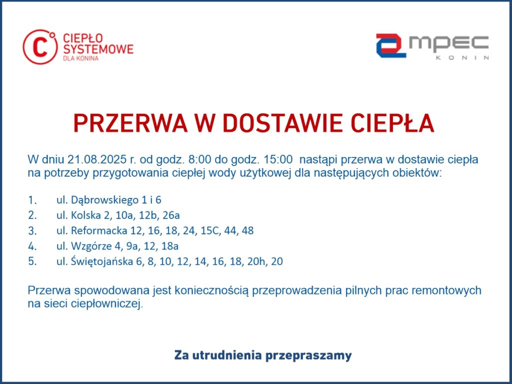 Komunikat MPEC w Koninie KoninSygnał 24 20/08/2025 Wyróżnione Wielkopolska łączy siły w walce z suszą – deklaracja 2026Redakcja - 03/04/20260Ponad 1,5 promila i jazda hulajnogą elektryczną. Zdarzenie zakończyło się uderzeniem w drzewoRedakcja - 13/03/20260Sygnał 24Dron znaleziony na terenie kopalni pod Koninem. Policja prowadzi działaniaRedakcja - 12/03/20260KoninNiepokojące dane z rynku pracy w regionie konińskimRedakcja - 19/02/20260KoninPrestiżowy patronat nad 28. Ogólnopolskim Biegiem Milowego SłupaRedakcja - 17/02/20260 FacebookXWhatsApp Redakcja Szukaj Konin słabe opady deszczu enter location 7.5 ° C 7.5 ° 7.5 ° 87 % 3.7kmh 100 % pon. 11 ° wt. 11 ° śr. 14 ° czw. 12 ° pt. 12 ° Sygnał24NEWS Włamania do garaży w Koninie. 21 zarzutów dla 22-latka 02/04/2026 Policja odzyskała skradzione przedmioty. Czy rozpoznajesz swoją własność? 16/03/2026 Turek: Nawet 10 lat więzienia za narkotyki. Policja zatrzymała mieszkańca powiatu tureckiego 16/03/2026 Konin: bez prawa jazdy, z narkotykami i poszukiwany. 31-latek zatrzymany przez policję 16/03/2026 Wypalanie traw jest nielegalne i niebezpieczne. Grożą za to poważne konsekwencje 16/03/2026 Ciało kobiety znalezione w stawie w gminie Chodów. Policja i prokuratura wyjaśniają sprawę 15/03/2026 Poprzedni artykułMZGOK – Wizyta Emerytów ElektrobudowyNastępny artykułMarzena Dopytalska ponownie dyrektorem Szkoły Podstawowej w Krzymowie. Trzecia kadencja rozpocznie się 1 września. Jedyna kandydatka w drugim konkursie Mogłeś przegapić SOWA Konin – warsztaty, promocje i atrakcje w kwietniu 03/04/2026 Wielki Piątek i Wielka Sobota bez opłat na SPP i MPP Aktualności 03/04/2026 Koniński Budżet Obywatelski. Rekordowa liczba zgłoszeń mieszkańców 02/04/2026
