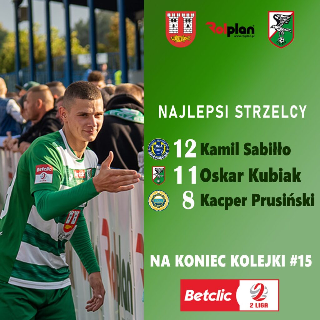 W znakomitej formie pozostaje Oskar Kubiak, który w ostatnim meczu przeciwko Podbeskidziu Bielsko-Biała zdobył hat-tricka, umacniając swoją pozycję w czołówce klasyfikacji strzelców. Po 15. kolejce zawodnik ma na koncie 11 bramek i samodzielnie zajmuje drugie miejsce w zestawieniu najlepszych snajperów.