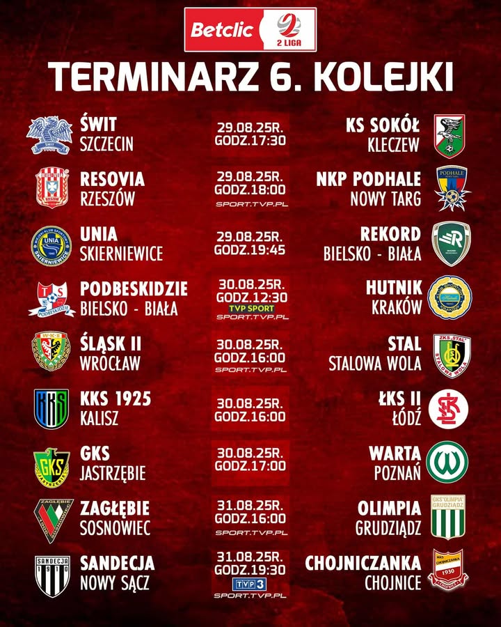 Klub Sportowy Sokół Kleczew poinformował, że w najbliższy piątek rozpocznie się 6. kolejka Betclic 2. Ligi. Już na inaugurację tej serii spotkań na boisku zmierzą się Świt Szczecin oraz Sokół Kleczew.