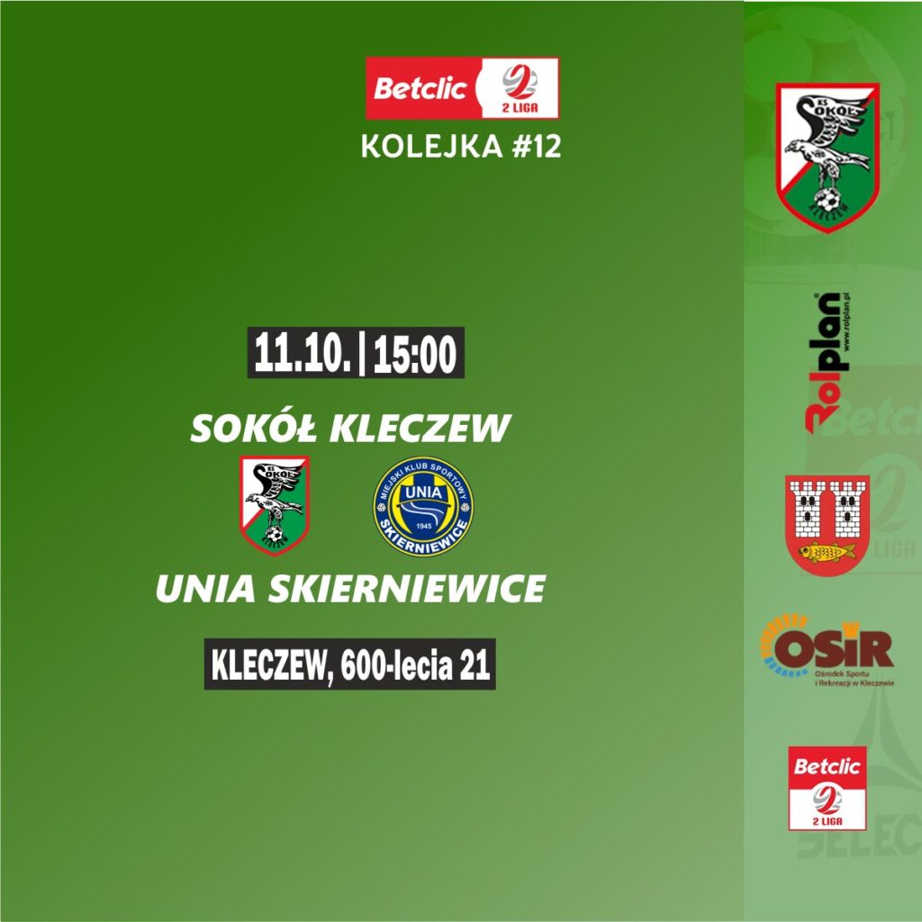 W najbliższą sobotę na Stadionie Miejskim w Kleczewie odbędzie się mecz 12. kolejki Betclic 2. Ligi. Sokół Kleczew rozegra szóste spotkanie w tym sezonie przed własną publicznością, a jego rywalem będzie beniaminek rozgrywek – Unia Skierniewice.