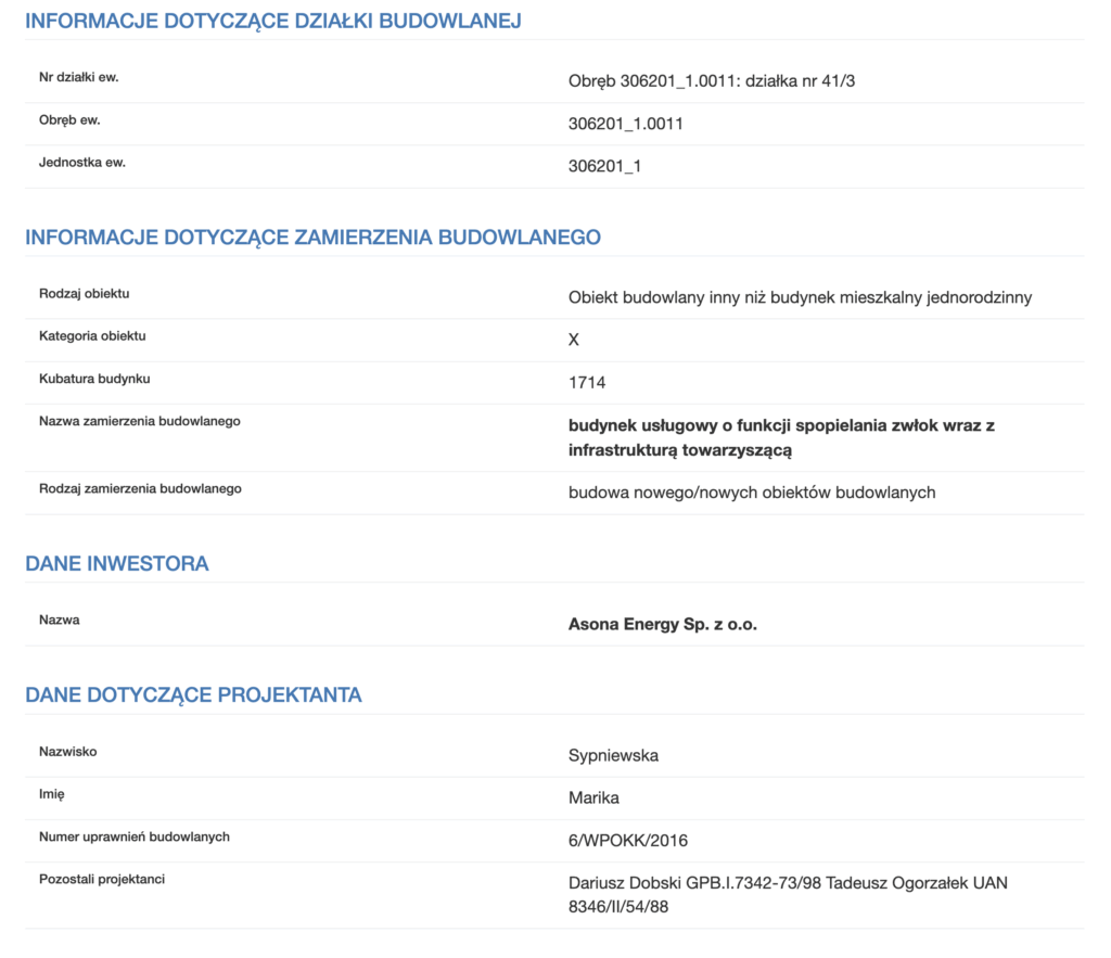 Piotr Muszalski: To bardzo dobre pytanie, bo sprawa dotyczy kwestii formalno-prawnych, a nie tylko samej kolejności rozpoczęcia i zakończenia budowy. Faktycznie, w przestrzeni publicznej pojawiają się informacje o inwestycji firmy Hades, natomiast zgodnie z oficjalnymi danymi zamieszczonymi na oficjalnej stronie Głównego Urzędu Nadzoru Budowlanego, tylko spółka Asona Energy wskazała prawidłowe zamierzenie budowlane jako wpis: