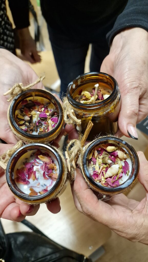 Warsztaty zakończyły się wspólną prezentacją gotowych świec. Uczestnicy wymieniali się wrażeniami, cieszyli się efektami swojej pracy i korzystali z kącika kawowego, kontynuując rozmowy w przyjaznej atmosferze. Spotkanie pozostawiło u seniorów poczucie dobrze spędzonego, twórczego czasu i satysfakcję z własnoręcznie wykonanych świec.