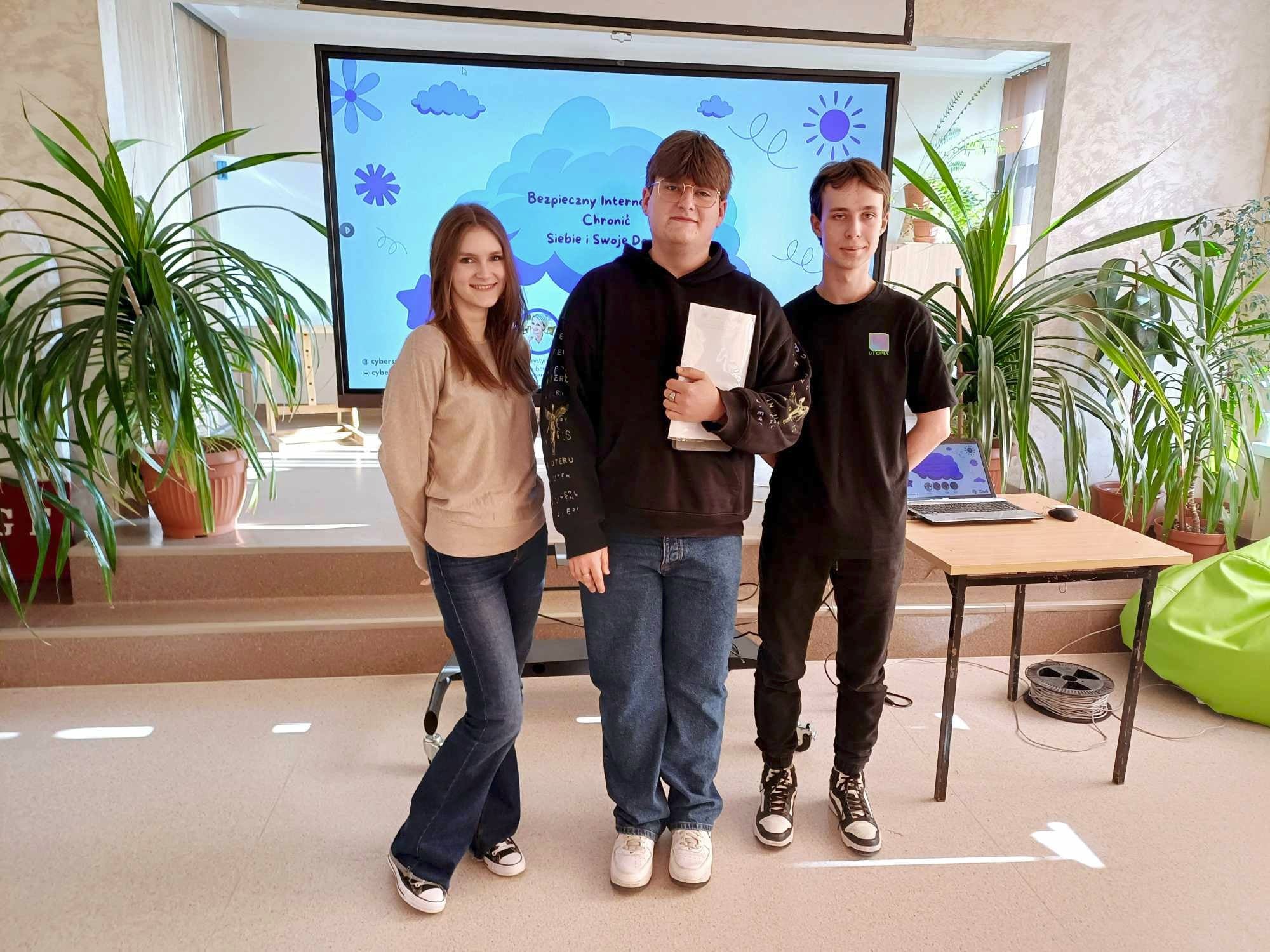 Wyróżnienie otrzymali uczniowie klasy 3TP: Julia Wojaczyk, Dawid Lawenda oraz Damian Mazurek. Młodzież aktywnie uczestniczyła w pracach szkolnego zespołu CYBERspot, który zorganizował szereg działań promujących bezpieczne korzystanie z Internetu wśród uczniów.