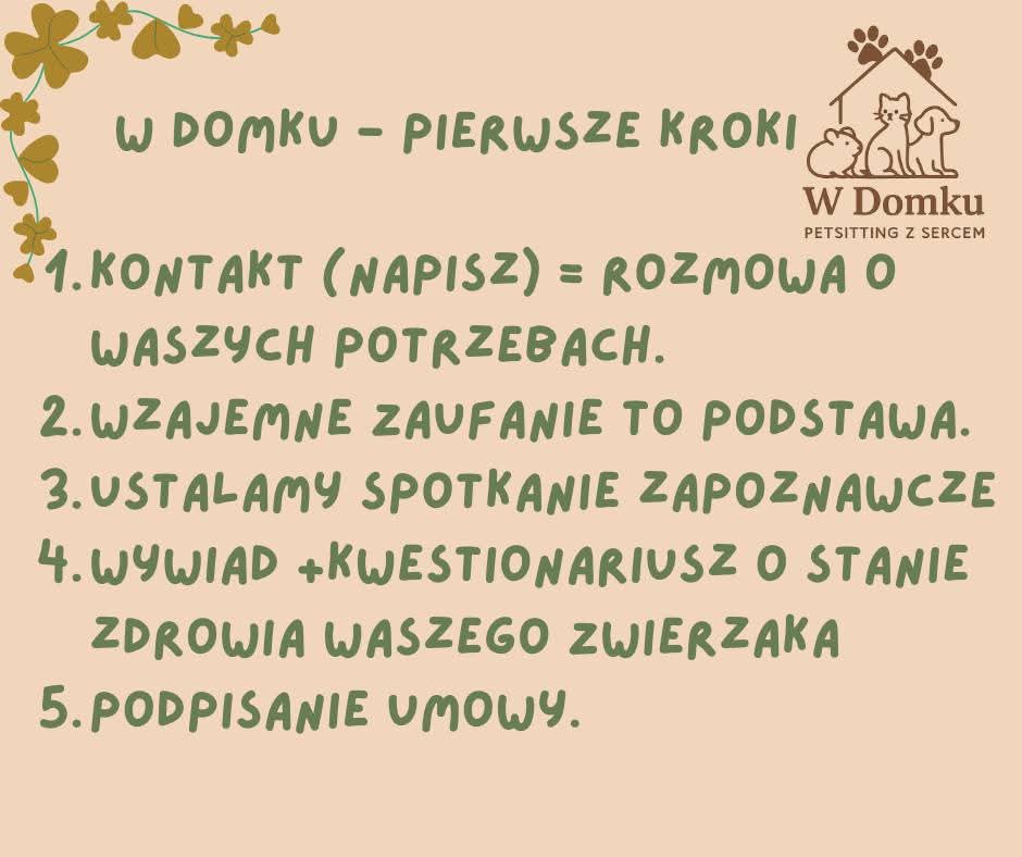 Każda opieka rozpoczyna się od kontaktu i rozmowy o potrzebach pupila, następnie ustalane jest spotkanie zapoznawcze, podczas którego budowane jest wzajemne zaufanie. Kolejnym krokiem jest wywiad oraz kwestionariusz zdrowotny, pozwalający dokładnie poznać stan zwierzęcia, a całość kończy podpisanie umowy.