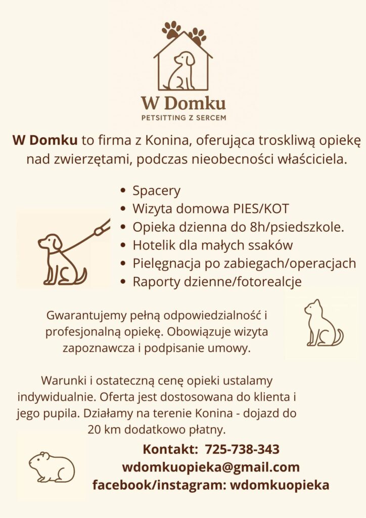 W czasie wyjazdu, choroby lub intensywnej pracy coraz więcej właścicieli zwierząt szuka bezpiecznej i sprawdzonej alternatywy dla tradycyjnych hoteli. Odpowiedzią na te potrzeby jest „W Domku” – lokalna firma z Konina. Oferuje profesjonalną, a jednocześnie domową opiekę nad zwierzętami, zawsze z naciskiem na ich komfort i dobrostan.