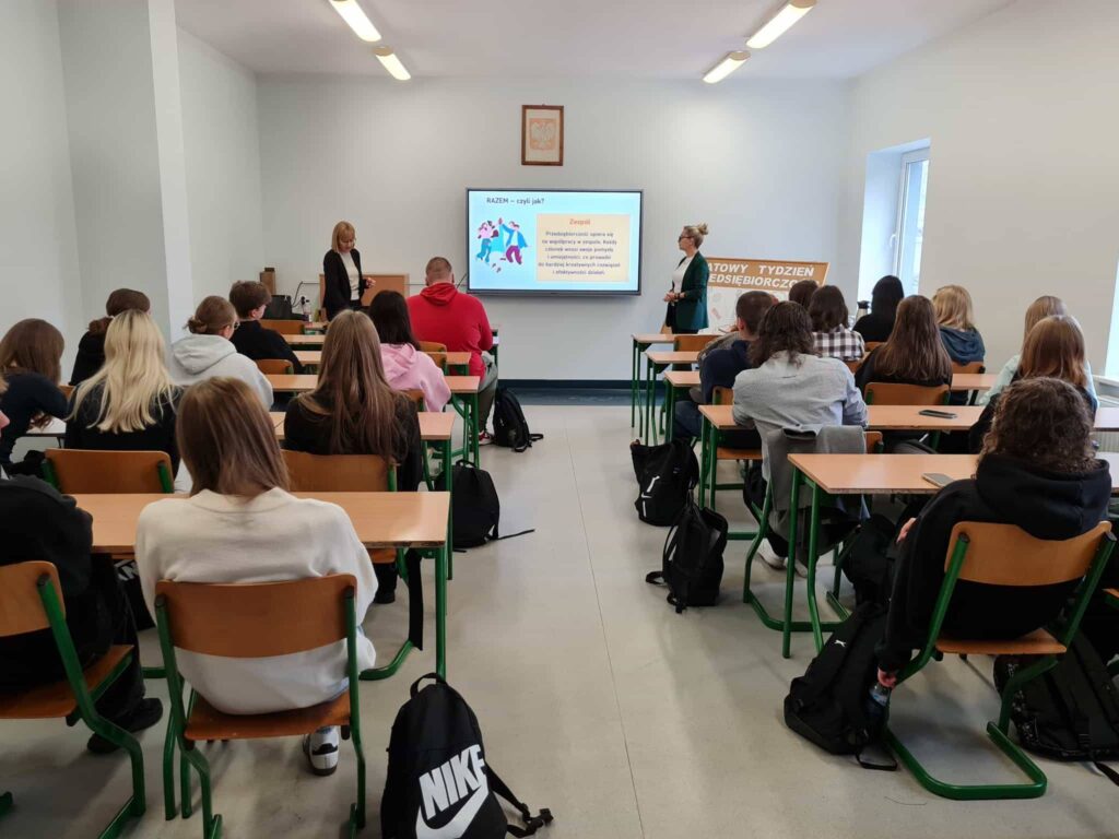 Podczas zajęć ekspertki poprowadziły warsztaty pod hasłem „Razem budujemy przedsiębiorczość”, skupione na rozwijaniu postaw i kompetencji niezbędnych w dorosłym życiu. Uczestnicy poznali praktyczne narzędzia wspierające podejmowanie decyzji, planowanie działań oraz świadome budowanie ścieżki zawodowej. W trakcie spotkania podkreślano znaczenie inicjatywy, kreatywności i odpowiedzialności — wartości istotnych zarówno w biznesie, jak i w codziennym funkcjonowaniu.