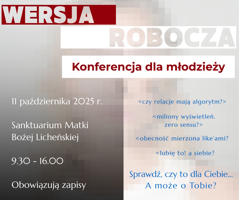 Sanktuarium Matki Bożej Licheńskiej zaprasza młodzież na konferencję pod hasłem „Wersja robocza”, która odbędzie się 11 października 2025 roku. Spotkanie skierowane jest do uczniów klas 6–8 szkół podstawowych, młodzieży szkół ponadpodstawowych oraz studentów.