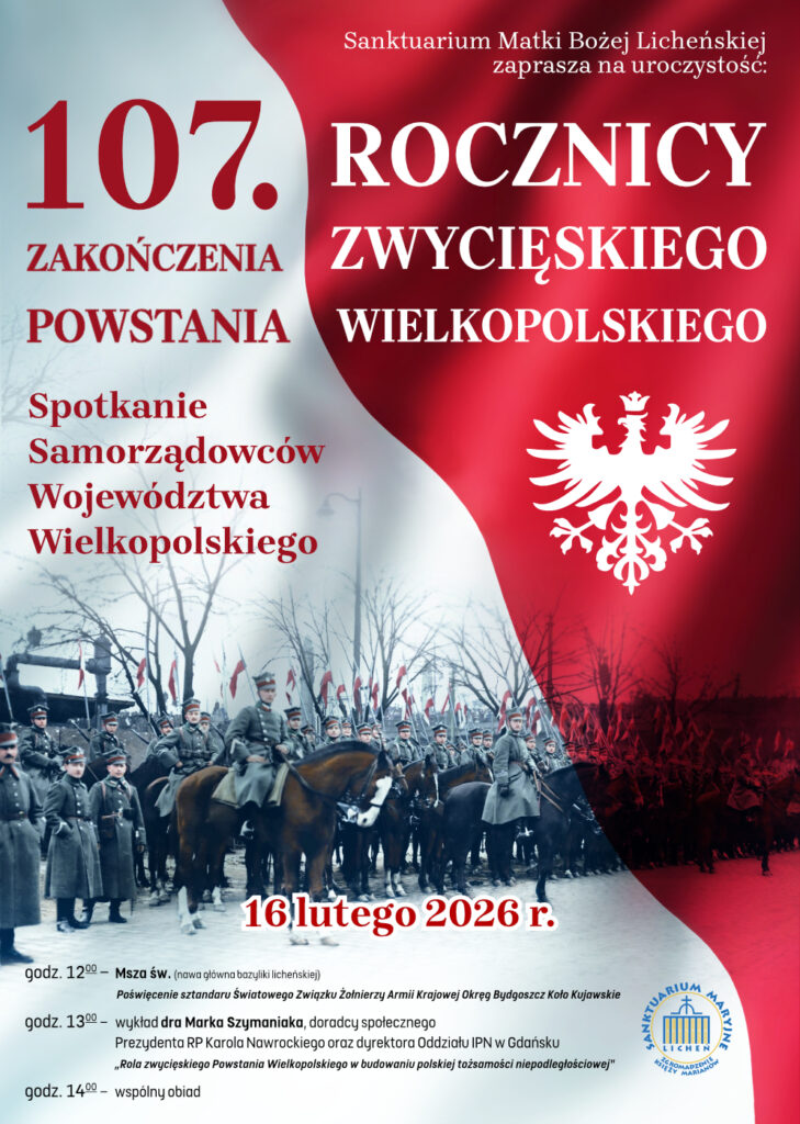 Uroczystości z okazji 107. rocznicy zakończenia Powstania Wielkopolskiego odbędą się w poniedziałek, 16 lutego, w sanktuarium Matki Bożej Licheńskiej. O godz. 12.00 w bazylice zostanie odprawiona Msza święta połączona z poświęceniem sztandaru Światowego Związku Żołnierzy Armii Krajowej Okręg Bydgoszcz Koło Kujawskie. Po liturgii zaplanowano wykład dra Marka Szymaniaka poświęcony roli Powstania Wielkopolskiego w budowaniu polskiej tożsamości niepodległościowej.