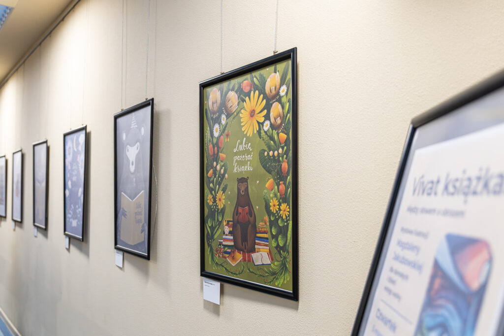 Część ekspozycji poświęcono także książkom ilustrowanym przez Magdalenę Jakubowską. W gablotach można zobaczyć publikacje, które cieszą się dużą popularnością wśród najmłodszych czytelników biblioteki oraz ich rodziców.